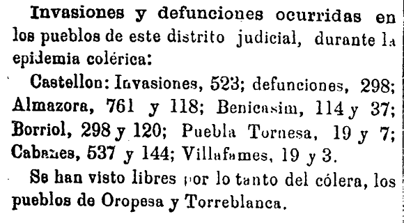 Tres meses después de la noticia del primer caso de cólera en la tercera epidemia de esta enfermedad en Castellón -tras las de 1834 y 1855- El Clamor de Castellón publica el 20 de septiembre de 1885 un balance de las «invasiones [contagios] y defunciones ocurridas en los pueblos de este distrito judicial», una vez atajada la propia epidemia. En la capital se contabilizan 523 contagios y 298 muertes, y asimismo se cifran los graves estragos de la enfermedad en Almassora, Benicàssim, Borriol, la Pobla Tornesa, Cabanes y Vilafamés, celebrando que se vieran libres del cólera Oropesa del Mar y Torreblanca.