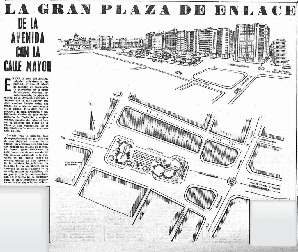 El último sábado de septiembre de 1970, Mediterráneo publica un gran plano en el que se esboza el proyecto de «la gran plaza de enlace de la avenida [del Mar] con la calle Mayor. La nueva plaza -que desde su apertura en 1975 recibirá el nombre de Cardona Vives- acogerá desde 1975 el primer aparcamiento subterráneo en la ciudad. Por la noticia, sabemos que precisamente en los días de su publicación, «los edificios casi ruinosos que ocupan los solares de la nueva futura plaza comienzan a caer» en un «viejísimo sector de la ciudad». El diario tilda la reforma urbana «de la máxima importancia».