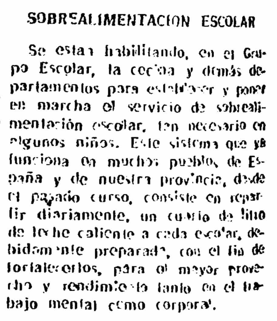 En este contexto, Mediterráneo informa en septiembre de 1955 de la introducción en el Grupo Escolar de Segorbe de la puesta en marcha de un «servicio de sobrealimentación escolar, tan necesario en algunos niños». La aplicación de este método, que ya funciona «en muchos pueblos de España y de nuestra provincia» desde el curso anterior, «consiste en repartir diariamente un cuarto de litro de leche caliente a cada escolar, debidamente preparada, con el fin de fortalecerlos, para el mayor provecho y rendimiento tanto en el trabajo mental como corporal».