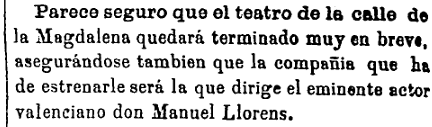 Siete meses después de su inicio, las obras del teatro nuevo de la calle de la Magdalena -hoy Escultor Viciano- avanzan a buen ritmo en los inicios del otoño de 1885, poco antes de su inauguración, que tendrá lugar el 23 de diciembre. El primer día de octubre, El Clamor de Castellón hace hincapié en que el coliseo «quedará terminado muy en breve» y especula con la posibilidad de que el estreno corresponda a la compañía dirigida por el «eminente actor valenciano Manuel Llorens«.