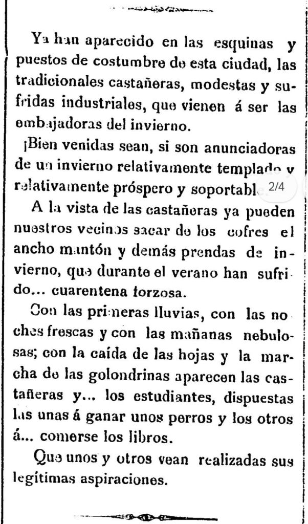 Un cierto lirismo se cuela en una noticia de la edición del 8 de octubre de 1895 en Heraldo de Castellón, que se hace eco de la incorporación al paisaje urbano, como cada otoño, de las tradicionales castañeras, «modestas y sufridas industriales, que vienen a ser las embajadoras del invierno». El diario les da la bienvenida e invita a los vecinos a «sacar de los cofres el ancho mantón y demás prendas de invierno, que durante el verano han sufrido… cuarentena forzosa». Y es que «con la caída de las hojas y la marcha de las golondrinas aparecen las castañeras… y los estudiantes».