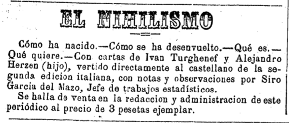 18 años después de que el novelista Iván Turguénev introdujera el término nihilista en su obra Padres e hijos (1862), el periódico castellonense El Clamor, órgano del Partido Democrático-Progresista de la provincia, comercializa un libro que, con el título El nihilismo promete explicar «cómo ha nacido», «cómo se ha desenvuelto», «qué es» y «qué quiere» esta corriente de pensamiento, que según el propio escritor ruso, se refiere a la persona «que no se inclina ante ninguna autoridad, que no acepta ningún principio como artículo de fe». Todo ello, «al precio de 3 pesetas ejemplar» y con cartas del propio Turguénev y de Alejandro Herzen.