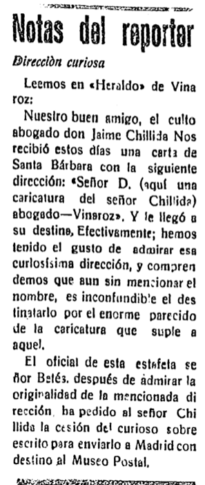 Bajo el título «Dirección curiosa», La Provincia Nueva se hace eco en octubre de 1930 de una curiosidad anotada en primer lugar por Heraldo de Castellón: el «culto abogado don Jaime Chillida Nos» ha recibido en Vinaròs «una carta de Santa Bárbara» sin su nombre y apellidos, reemplazados los mismos por una caricatura del destinatario. «Hemos tenido el gusto de admirar esa curiosísima dirección, y comprendemos que aun sin mencionar el nombre, es inconfundible el destinatario por el enorme parecido de la caricatura», señala el periódico. Años después, tras la Guerra Civil, Chillida será durante 13 días el primer alcalde nombrado por el franquismo en la localidad (ver notas biográficas en la Vinapedia).