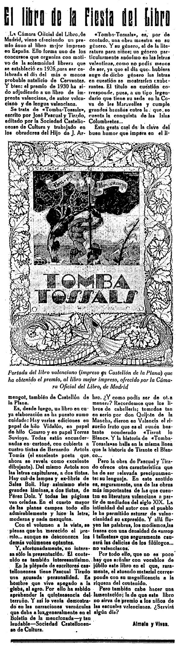 En octubre de 1930, Heraldo de Castellón se hace eco en su portada del éxito obtenido por Tombatossals al merecer un galardón de la Cámara Oficial del Libro de Madrid a la mejor edición del año. En un artículo firmado por el escritor y archivero vinarocense Francesc Almela i Vives, se habla del libro como «una obra maestra en su género», refiriéndose a la literatura infantil. Asimismo, se señala como «una de las obras más importantes de las que cuentan en literatura valenciana a partir de mediados del siglo XIX». Además, Almela elogia el trabajo en la edición de los colaboradores Lluís Sales Boli, Francisco Pérez Dolz y Bernat Artola.