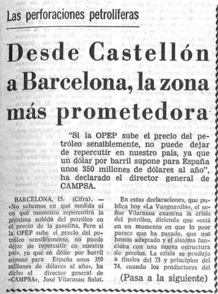 11 años después de autorizarse por el Gobierno, en 1964, la construcción de la refinería de petróleos de ESSO en el Grao de Castellón, el oro negro es protagonista de noticias en Mediterráneo por un motivo muy diferente: las «perforaciones petrolíferas» que se llevan a cabo en distintos puntos de la costa. En octubre de 1975, el motivo son unas declaraciones a La Vanguardia de Josep Vilarasau, director general de CAMPSA, según las cuales, para dichas prospecciones, «la zona más prometedora es la cuenca mediterránea desde Castellón hasta Barcelona».