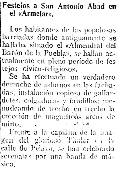 Los festejos «cívico-religiosos» que se celebran en honor a San Antonio Abad al sur de la ciudad son el centro de esta breve noticia que publica Diario de Castellón a mediados de octubre de 1925. El periódico da detalles de cómo llevan a cabo las fiestas «los habitantes de las antiguas barriadas donde antiguamente se hallaba situado el Almendral del Barón de la Puebla«, también conocido en valenciano como el Armelar, en denominación que llegará al siglo XXI. El periódico elogia el «verdadero derroche de adornos» del vecindario en sus fachadas y refiere la presencia de una «capillita» del Santo en la calle Pelayo, frente a la cual se celebran «serenatas» por una banda de música.