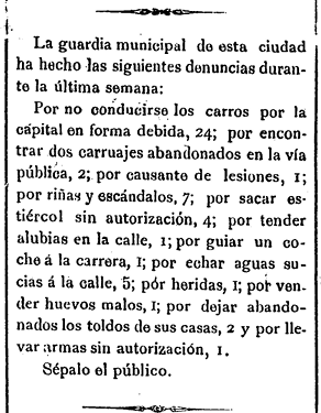 A finales del siglo XIX, la abrumadora mayoría de las denuncias formuladas por la guardia municipal de la capital de la Plana se produce «por no conducirse los carros por la capital en forma debida». En una semana cualquiera de octubre de 1895, Heraldo de Castellón contabiliza 24 casos de esta infracción, y otros dos por «carruajes abandonados en la vía pública». El siguiente epígrafe con más denuncias es el de «riñas y escándalos», que asciende a siete esa semana. El resto de la relación incluye la cifra de cuatro casos denunciados «por sacar estiércol sin autorización», uno «por tender alubias en la calle» y otro «por vender huevos malos», sin olvidar otros dos vecinos denunciados «por dejar abandonados los toldos de sus casos».
