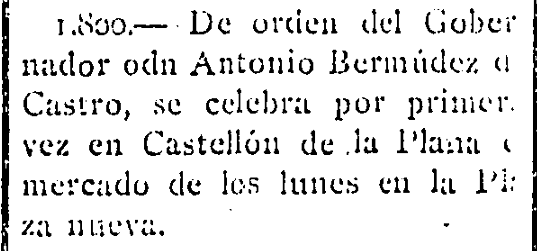 Las efemérides del Diario de la Mañana de finales de octubre de 1930 refrescan a los lectores la memoria del paso del Mercado del Lunes desde la plaza Mayor a la plaza Nueva -parte sur de la actual avenida del Rey don Jaime-, que se produce el día 27 del mismo mes de 1800 «de orden del gobernador don Antonio Bermúdez de Castro«. Así lo recogería también más adelante José Sánchez Adell, aunque con una pequeña imprecisión en cuanto al día exacto del primer mercado en el lugar: «por iniciativa del gobernador Bermúdez de Castro, se arrancan los olivos y se terraplenan las tierras en 1799 más allá de la muralla oeste, en las heredades vecinas de los alfares o cantarería, propiedad del Obispo Climent, dando origen a la Plaza Nueva», donde el 28 de 1800 se celebró el primer mercado del Lunes”.