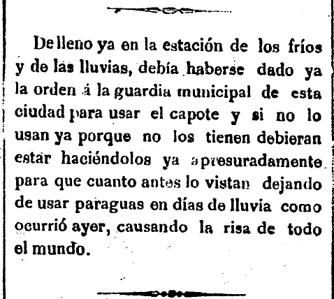 El último día de octubre de 1895, Heraldo de Castellón advierte al Ayuntamiento de la capital porque «de lleno ya en la estación de los fríos y de las lluvias, debía haberse dado ya la orden a la guardia municipal de esta ciudad para usar el capote». Para el periódico, «si no lo usan ya porque no los tienen, debieran estar haciéndolos ya apresuradamente» para dejar de usar paraguas en días de lluvia «como ocurrió ayer, causando la risa de todo el mundo».