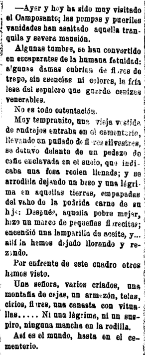 El vespertino El Regional muestra su escándalo, el día de los Fieles Difuntos, por la «ostentación» y «las pompas y pueriles vanidades» que observa en el cementerio de Castellón en dicha jornada y en su víspera, Todos los Santos. Asegura que «algunas tumbas se han convertido en escaparates de la humana fatuidad», si bien aprecia el contraste con «una vieja vestida de andrajos» que con unas flores silvestres acude a rendir tributo a un hijo recientemente fallecido, respecto de otras escenas como la siguiente: «»Una señora, varios criados, una montaña de cajas, un armazón, telas, cirios, flores, una canasta con vituallas… ni una lágrima, ni un suspiro, ninguna mancha en la rodilla». La conclusión del periódico es categórica: «así es el mundo, hasta en el cementerio».