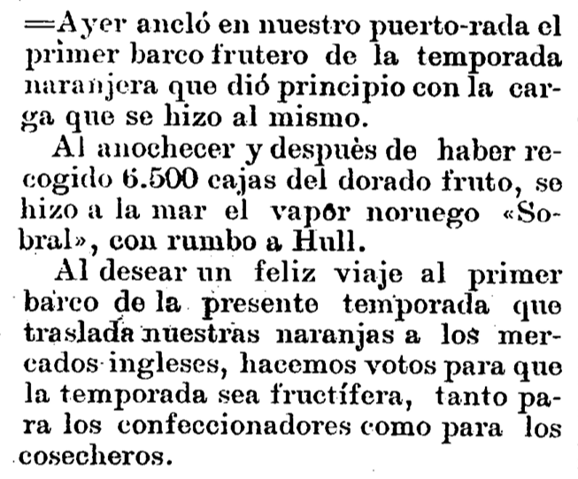 El puerto de Hull, en la costa Este de Inglaterra, es el destino del primer barco frutero de la temporada naranjera de 1915, que sale desde Castellón el 7 de noviembre. Según recoge Heraldo de Castellón, el vapor noruego Sobral carga 6.500 cajas del «dorado fruto» en el Puerto de Castellón. El periódico muestra sus deseos de que la temporada «sea fructífera, tanto para los confeccionadores como para los cosecheros», en un contexto difícil marcado por la I Guerra Mundial.