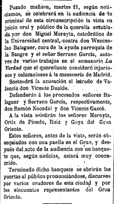 Quien llevará la voz cantante de la acusación es nada menos que Miguel Morayta, primer Gran Maestre del Grande Oriente Español. El juicio, que será seguido con gran interés, además de dirimir el asunto concreto que es su objeto principal, sirve a Morayta para poner sobre la mesa la existencia de personalidad jurídica de su organización. A su lado, formula la acusación el valenciano Vicente Dualde, republicano y anticlerical como Morayta, mientras que la defensa la lideran el polemista católico madrileño Ramón Nocedal y el abogado local y también redactor de La Verdad, Vicente Gascó Pastor. Los sacerdotes serán absueltos.