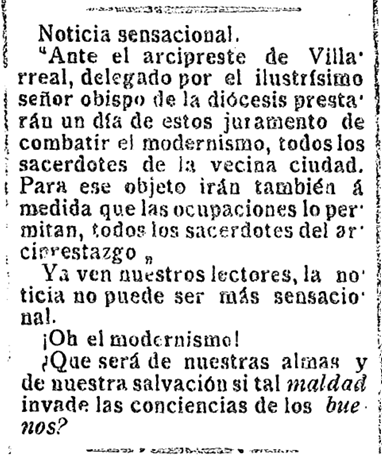 El sábado 12 de noviembre de 1910, El Clamor informa a sus lectores de lo que califica como «noticia sensacional»: ante el arcipreste de Vila-real, «prestarán un día de estos juramento de combatir el modernismo, todos los sacerdotes de la vecina ciudad», a los que seguirán, a medida que sus ocupaciones lo permitan, «todos los sacerdotes del arciprestazgo». El diario republicano se toma el asunto con ironía: «¿Qué será de nuestras almas y de nuestra salvación si tal maldad invade las conciencias de los buenos?»