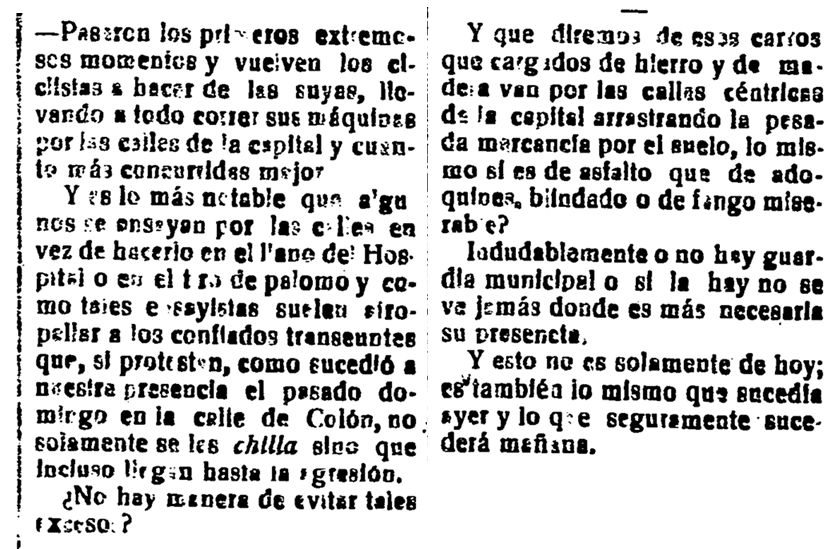 A mediados de noviembre de 1925, Heraldo de Castellón se lamenta porque al parecer, después de algún periodo de relativa paz, «vuelven los ciclistas a hacer de las suyas, llevando a todo correr sus máquinas por el centro de la capital y cuanto más concurridas mejor». Denuncia el periódico los atropellos de «confiados transeúntes» que en caso de protestar, «no solamente se les chilla sino que incluso llegan hasta la agresión». A renglón seguido, el diario protesta también contra los conductores de carros de hierro y madera que circulan por las calles céntricas «arrastrando la pesada mercancía por el suelo, lo mismo si es de asfalto que de adoquines, blindado o de fango miserable». La conclusión: «o no hay guardia municipal o si la hay no se ve jamás donde es más necesaria su presencia». Y el augurio final: es «lo mismo que sucedía ayer y lo que seguramente sucederá mañana».