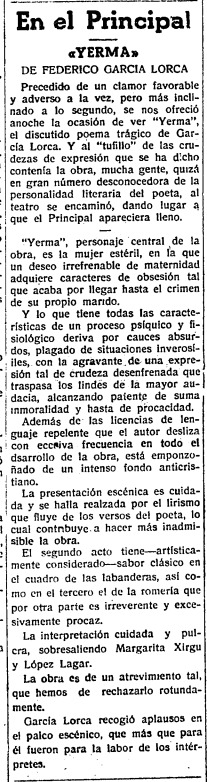 Finalmente, el católico Diario de Castellón subraya el lleno del Teatro Principal ante un título «precedido de un clamor favorable y adverso a la vez». La crítica, dura por momentos, no tiene desperdicio. Por ejemplo: «La presentación escénica es cuidada y se halla realzada por el lirismo que fluye de los versos del poeta lo cual contribuye a hacer más inadmisible la obra». O, a continuación: «La obra es de un atrevimiento tal que hemos de rechazarlo rotundamente». Finalmente, el periódico interpreta que los aplausos recibidos por García Lorca en el palco escénico «más que para él fueron para la labor de los intérpretes». Al autor granadino le queda menos de un año de vida, pues fallecerá asesinado en agosto de 1936, al comienzo de la Guerra Civil.