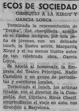 Al día siguiente, el propio Heraldo informa de cómo termina la noche de la representación: es «obsequiada» en el Casino Antiguo por «una peña de jóvenes» con un «delicado lunch» la «ilustrada actriz», Margarita Xirgu, «y el no menos ilustre autor de tan celebrada obra, García Lorca». Se suman al homenaje la empresa del teatro, Radio Castellón y «un grupo de periodistas y escritores locales». Al acabar este encuentro, los asrtistas y el director de la compañía, Cipriano Rivas Cherif -cuñado de Manuel Azaña-, emprenden viaje en coche a Barcelona.