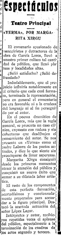 El martes 12 de noviembre de 1935, tanto República como Diario de Castellón publican un anuncio del Teatro Principal sobre la actuación de la «gran compañía de comedias» de Margarita Xirgu. Sin embargo, la obra a representar no es precisamente una comedia: se trata de Yerma, poema dramático en tres actos de Federico García Lorca, quien está en el cenit de su carrera artística.