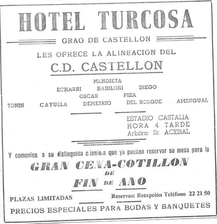 El domingo 15 de noviembre de 1970, el francés Lucien Müller debuta en Castalia como entrenador del CD Castellón, en un encuentro liguero de 2ª División ante el Cádiz CF. El míster, que terminará dirigiendo el partido más importante de la historia del club -la final de Copa de 1973- se encuentra esa mañana con su primera alineación en Mediterráneo, inserta en un anuncio del Hotel Turcosa. El once está compuesto por Mendieta, Echarri, Babiloni, Diego, Óscar, Pizá, Tonín, Cayuela, Demetrio, Del Bosque y Amengual. En el reclamo se publicita también la «gran cena-cotillón de fin de año».