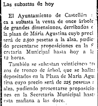 La actividad ordinaria del Ayuntamiento de Castellón en las primeras décadas del siglo XX se vincula a una economía local muy centrada en el sector primario y en el aprovechamiento de los recursos naturales del municipio. Así, en noviembre de 1930, el Diario de la Mañana recoge sendas subastas de madera. Por un lado, se trata «la venta de once árboles de grandes dimensiones, derribados en la plaza de María Agustina, cuyo precio será de 2.500 pesetas a la alza». Por el otro, se subastan «veinticinco trozos de tronco de árbol», con un importe inicial de 225 pesetas (el precio del periódico que lo anuncia es de 10 céntimos en ese momento). En ambos casos, las ofertas se recogen en la Secretaría Municipal.