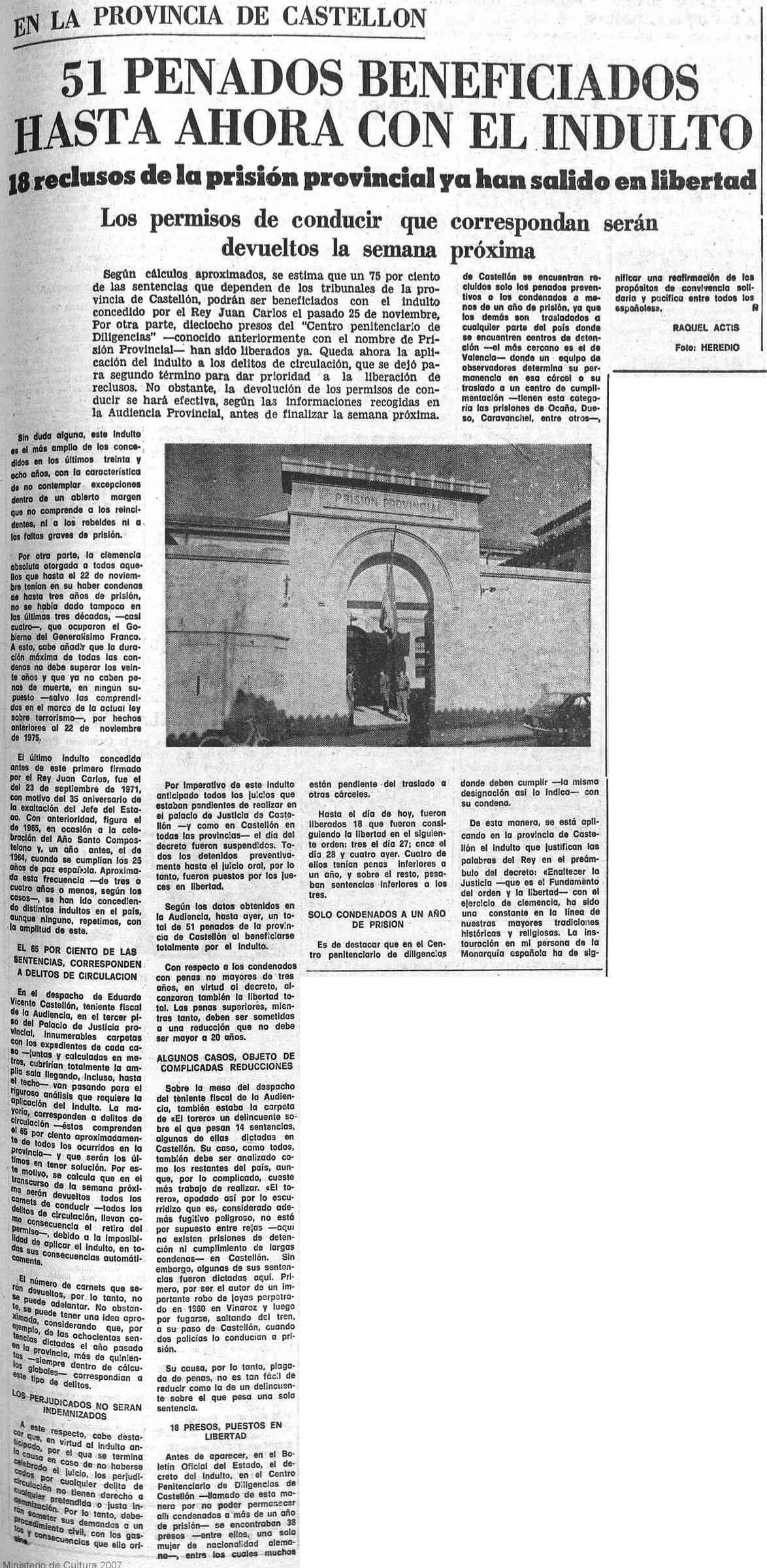 El indulto general que el Rey Juan Carlos I concede con motivo de su exaltación al trono, publicado en la edición del BOE del 25 de noviembre de 1975, beneficia a un total de 51 penados de la provincia de Castellón, según recoge cinco días más tarde Raquel Actis en Mediterráneo. Según la noticia, diez días después de la muerte del dictador Francisco Franco ya son 18 los reclusos de la prisión provincial que han salido en libertad. Asimismo, se destaca que el 65% de los delitos que se cometen en la provincia se corresponden con infracciones de tráfico. La pieza está ilustrada con una imagen de Heredio Iserte correspondiente a la puerta principal de la cárcel de la Ronda Magdalena, que será derribada en el verano de 1985.
