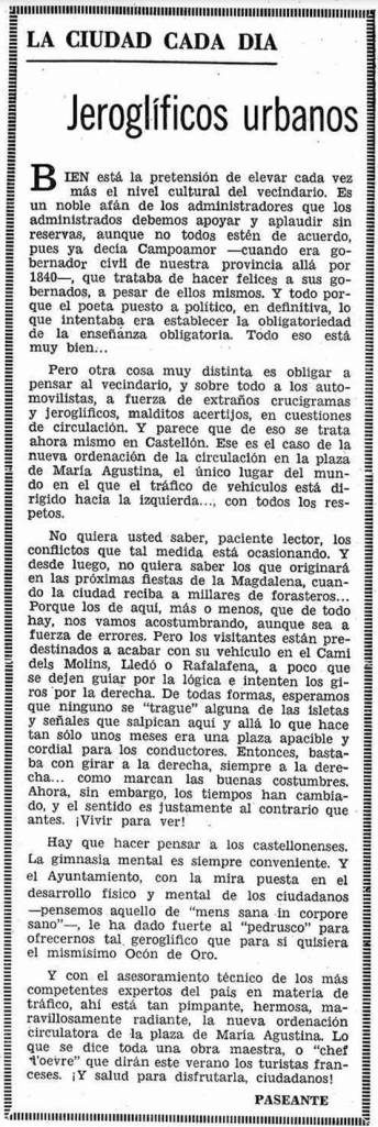 Dos meses después, el 8 de febrero de 1976, Paseante recurre a la ironía con un artículo de opinión en el diario señalando que con dicho cambio, el Ayuntamiento de Castellón quiere «hacer pensar» a los castellonenses: «la gimnasia mental siempre es conveniente», sentencia.