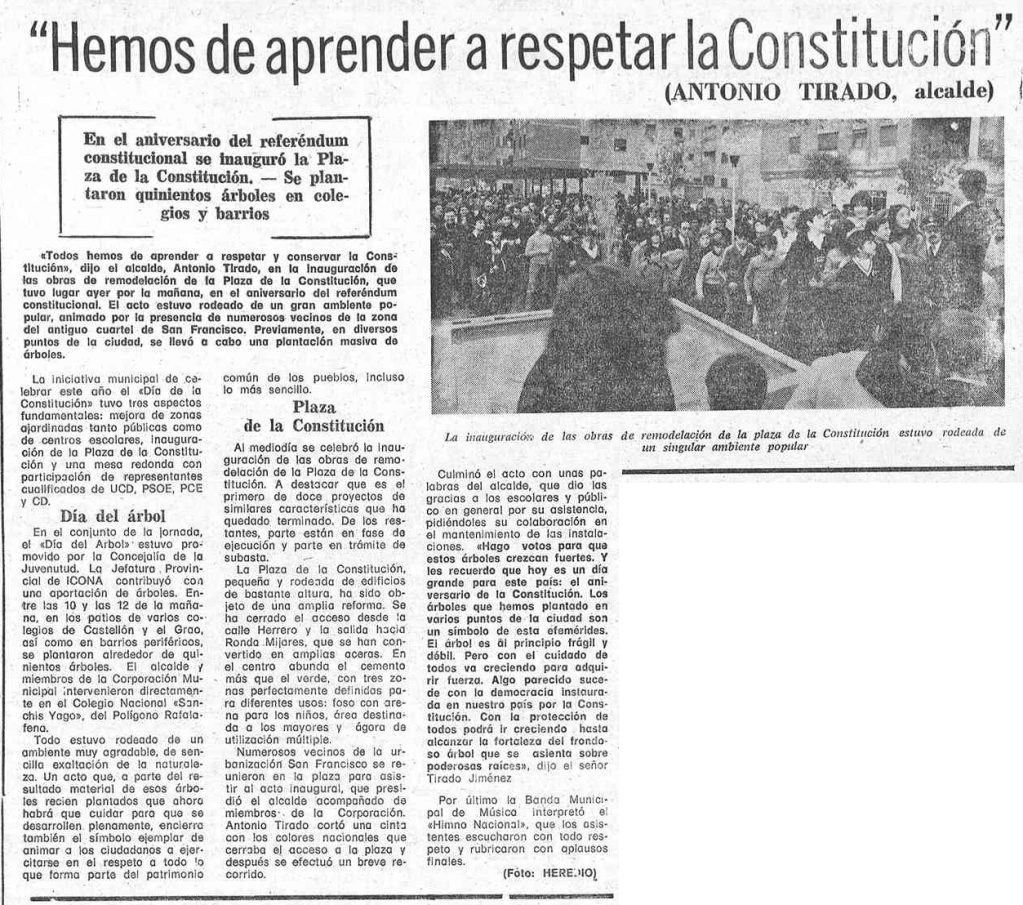 El segundo aniversario del referéndum en el que se aprueba la Constitución Española de 1978 se celebra el sábado 6 de diciembre de 1980. Con este motivo, en Castellón y según recoge Mediterráneo, se inaugura la nueva plaza que lleva el nombre de la Carta Magna y se plantan 500 árboles en colegios y barrios de la ciudad, aportados al menos parcialmente por ICONA. El alcalde y parte de la corporación se suman a esta operación en el Colegio Nacional Sanchis Yago del polígono Rafalafena. Con ocasión de la jornada, Antonio J. Tirado hace un llamamiento: «hemos de aprender a respetar la Constitución».