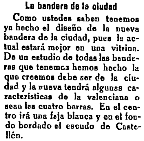El sábado 6 de diciembre de 1930, Heraldo de Castellón informa sobre «el diseño de la nueva bandera de la ciudad», llamada a sustituir a la anterior, que «estará mejor en una vitrina» según palabras textuales del alcalde Manuel Breva Perales. Así, la nueva enseña «tendrá algunas características de la valenciana, o sean (sic) las cuatro barras», con «una faja blanca» en el centro «y en el fondo bordado el escudo de Castellón». No tendrá recorrido histórico esta bandera, y dos décadas después, y tras el llamado centenario verde (1952), empezará a utilizarse la que llegará hasta el siglo XXI, con la franja verde inspirada al parecer en el Llibre Vert.