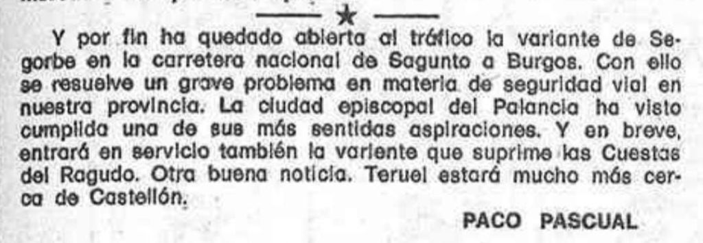 La apertura al tráfico de la variante de Segorbe en la N-234 (Sagunto-Burgos) supone, en vísperas de la Navidad de 1980, un avance muy importante en la conexión por carretera con la provincia de Teruel: según recoge Paco Pascual en su columna dominical La semana sin domingo, «con ello se resuelve un grave problema en materia de seguridad vial en nuestra provincia» al dejar de atravesar la carretera el casco urbano segorbino y viendo cumplida la capital del Alto Palancia «una de sus más sentidas aspiraciones». Asimismo, el cronista constata que «en breve, entrará en servicio también la variante que suprime las Cuestas del Ragudo».