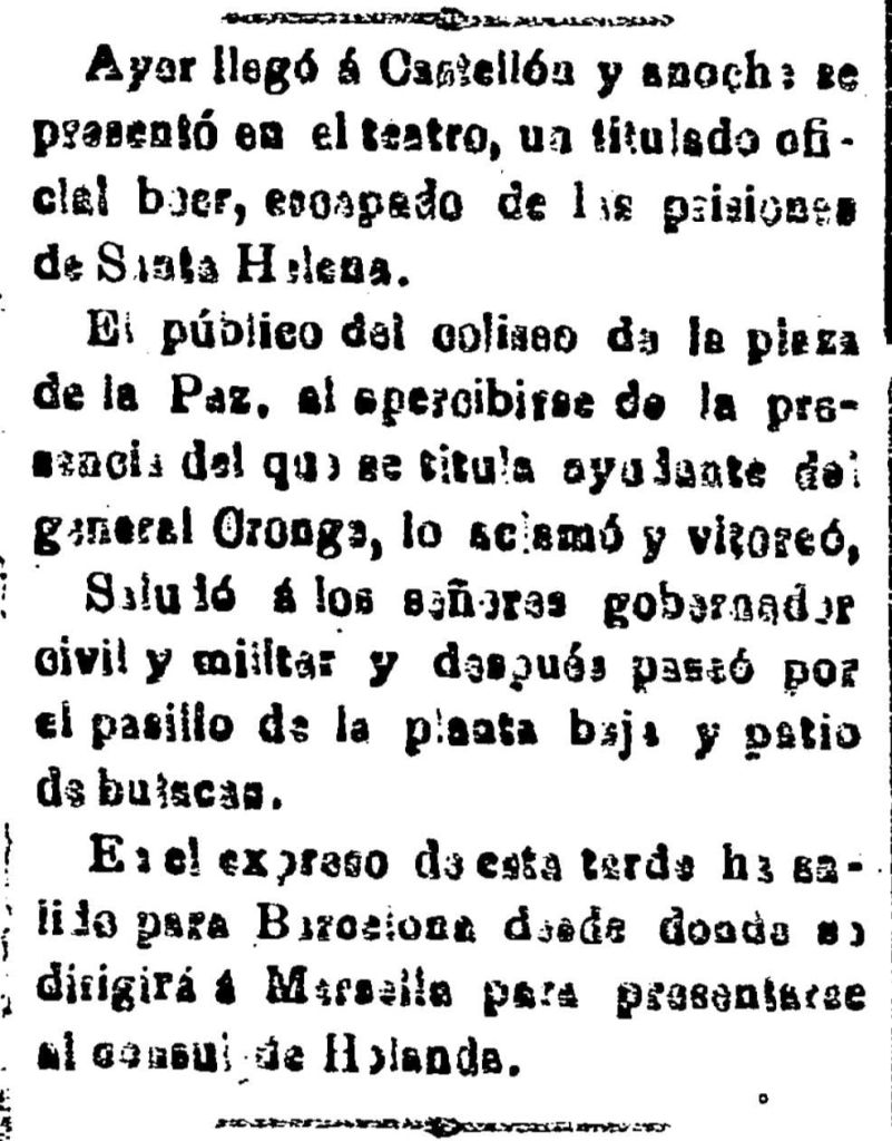 En mitad de la segunda guerra anglo-bóer sobre el suelo de la actual Sudáfrica, Heraldo de Castellón se hace eco a finales de 1900 de la sorprendente presencia en el Teatro Principal de Castellón, de «un titulado oficial bóer, escapado de las prisiones de Santa Helena», la misma isla del Atlántico donde vivió desterrado Napoleón.