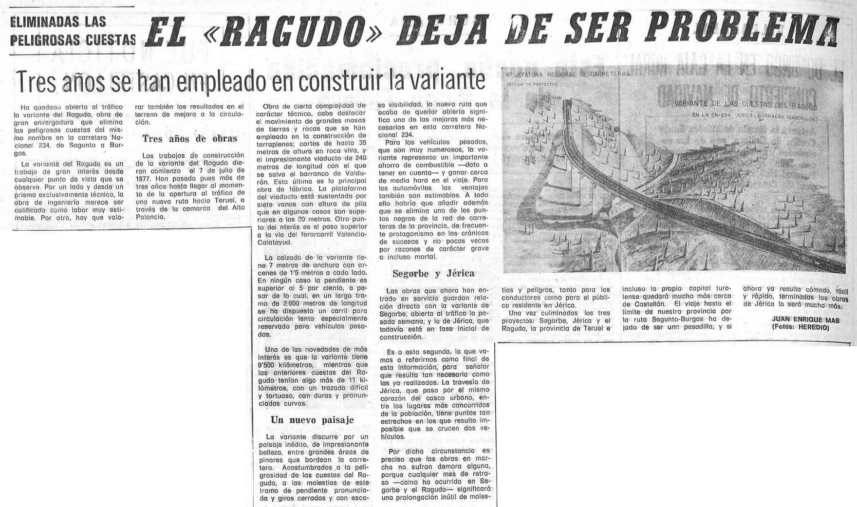 Tras dos años y medio de obras, el penúltimo sábado de diciembre de 1980, Mediterráneo anuncia que el puerto del Ragudo «deja de ser problema» para la circulación, al haber sido «eliminadas las peligrosas cuestas» con la apertura al tráfico de la variante. La información firmada por Juan Enrique Mas recuerda que los trabajos habían comenzado el 7 de julio de 1977 y celebra que el viaje hasta el límite con la provincia de Teruel por la carretera nacional 234 (Sagunto-Burgos) «ha dejado de ser una pesadilla» y desde este momento «ya resulta cómodo, fácil y rápido», a la espera de completarse la variante de Jérica, puesto que la de Segorbe ya ha sido llevada a término.