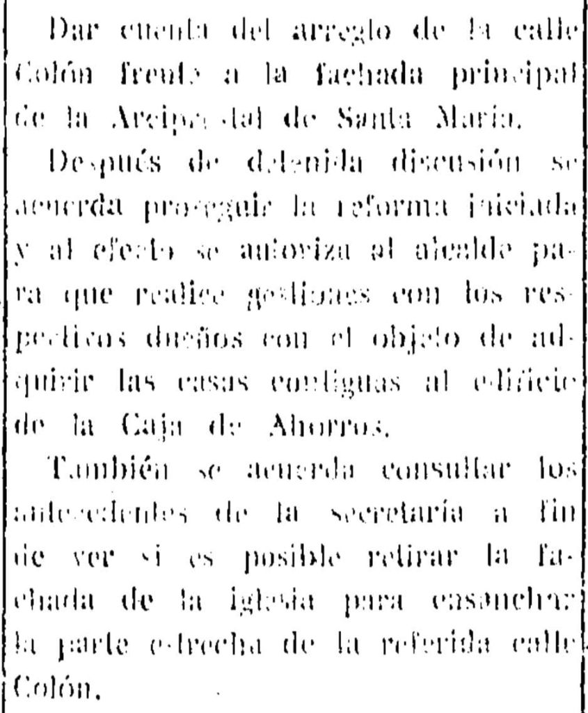 El día de Navidad de 1930, Diario de Castellón publica la reseña del pleno municipal de la capital, en el que se da cuenta «del arreglo de la calle Colón frente a la fachada principal de la Arciprestal de Santa María». Los concejales acuerdan «proseguir la reforma iniciada» y se autoriza al alcalde Manuel Breva Perales a gestionar la adquisición de «las casas contiguas al edificio de la Caja de Ahorros». Asimismo, se estudia la posibilidad de «retirar la fachada de la iglesia para ensanchar la parte estrecha» de la misma calle.