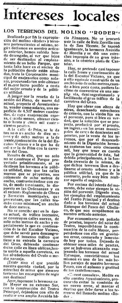 Los terrenos del antiguo Molí Roder -hoy ocupados por la plaza Borrull- protagonizan el inicio del año 1926 en Heraldo de Castellón por la incertidumbre sobre su destino final, tras su adquisición a la Diputación de Valencia en agosto del año anterior y el derribo del viejo molino. «Lejos de ser destinados al emplazamiento de un bello Parque, que tanta falta hace en el núcleo de la población (…) trata la Corporación municipal de enajenarlos como solares, procurando tan solo obtener el mayor lucro posible a costa del mejor ornato y de la pública utilidad». Según una reseña del pleno municipal, se trata de enajenar 4.517 metros cuadrados para tratar de obtener 185.400 pesetas, después de haber invertido «unas 50.000» en su compra, según había informado el propio periódico dos semanas antes.