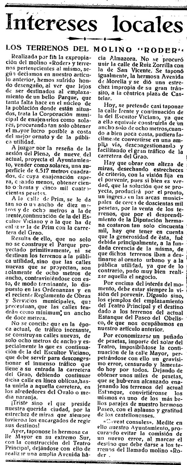 Los terrenos del antiguo Molí Roder -hoy ocupados por la plaza Borrull- protagonizan el inicio del año 1926 en Heraldo de Castellón por la incertidumbre sobre su destino final, tras su adquisición a la Diputación de Valencia en agosto del año anterior y el derribo del viejo molino. «Lejos de ser destinados al emplazamiento de un bello Parque, que tanta falta hace en el núcleo de la población (…) trata la Corporación municipal de enajenarlos como solares, procurando tan solo obtener el mayor lucro posible a costa del mejor ornato y de la pública utilidad». Según una reseña del pleno municipal, se trata de enajenar 4.517 metros cuadrados para tratar de obtener 185.400 pesetas, después de haber invertido «unas 50.000» en su compra, según había informado el propio periódico dos semanas antes.