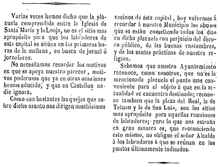 El primer jueves de 1866, La Revista Castellonense vuelve «á recordar a nuestro Municipio los abusos que se están cometiendo todos los días» en la plaza de la Hierba, «la plazuela comprendida entre la Iglesia de Santa María y la Lonja». Es el lugar donde los labradores de la capital se reúnen «en las primeras horas de la mañana, en busca de jornal ó jornaleros». Es una queja ya expresada con anterioridad, porque según esta publicación -autodenominada Periódico de intereses materiales y literatura– los encuentros en dicha plaza se producen «con perjuicio del decoro público, de las buenas costumbres y de las santas prácticas de nuestra religión». En opinión del periódico, el alcalde Carlos Ferrer Segarra debiera obligar a los labradores a reunirse en otros lugares, como las plazas del Real, de Tetuán o de San Luis.