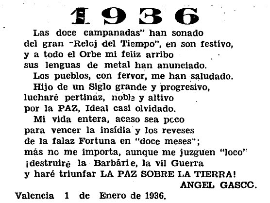 Ángel Gascó recibe el año 1936 desde la portada de Heraldo de Castellón del miércoles 1 de enero con un soneto en rima consonante, que al cabo de unos meses sonará como el reverso trágico de una profecía que quiso ser alegre. Es el propio año recién llegado quien pronuncia las palabras que componen el poema, y entre ellas, su contundente final: «aunque me juzguen loco, / ¡destruiré la Barbárie, la vil Guerra / y haré triunfar LA PAZ SOBRE LA TIERRA!».