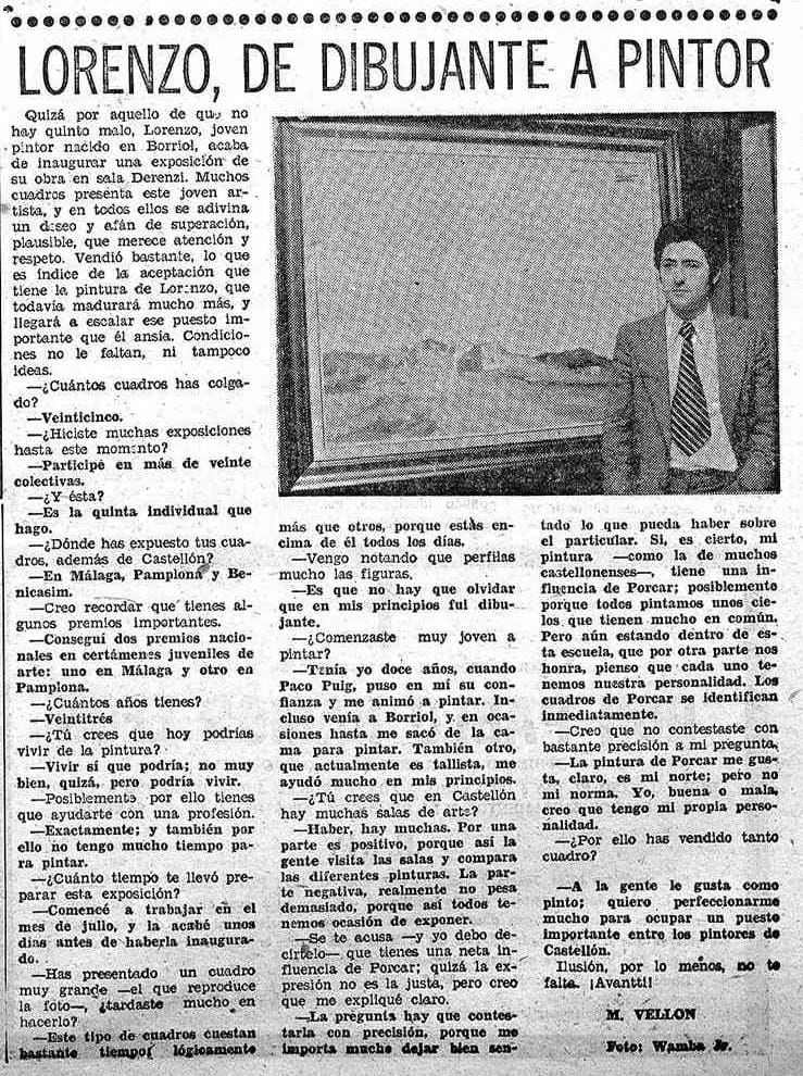 Inaugurar la quinta exposición individual de pintura a los 23 años no es algo al alcance de cualquiera. Pero el borriolense Lorenzo Ramírez Portolés lo hace a comienzos de 1976 en la galería Derenzi de Castellón, como recoge Mediterráneo el 7 de enero. Hablando con Manuel Vellón ante la cámara de Vicente Traver, Wamba Jr, el artista defiende su personalidad propia aun admitiendo la influencia de Juan Bautista Porcar y exhibe un afán perfeccionista «para ocupar un puesto importante entre los pintores de Castellón». El entrevistador subraya que en la muestra «vendió bastante, lo que es índice de la aceptación que tiene la pintura de Lorenzo, que todavía madurará mucho más». El augurio se cumplirá y la firma de Lorenzo se convertirá una referencia en temáticas como los paisajes o la pintura de fiestas, con una evolución estilística que llevará hasta sus últimos años de trayectoria. Fallecerá a los 65 años, en 1917.