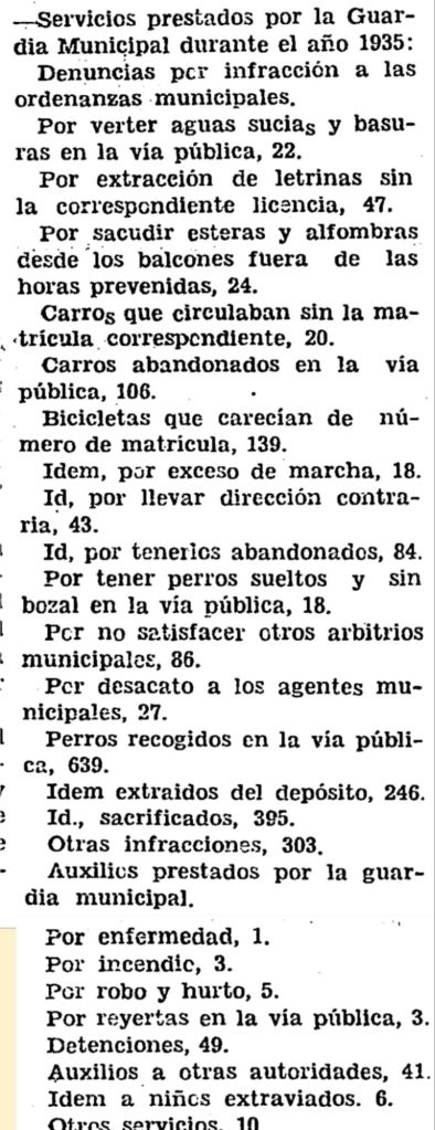 El día de Reyes de 1936, Heraldo de Castellón publica un balance de los «servicios prestados por la Guardia Municipal» del Ayuntamiento de la capital durante el ejercicio anterior. Entre otras llamativas denuncias propias de la época, se encuentran las de «carros abandonados en la vía pública», que en 1935 ascienden a 106. Asimismo, 47 denuncias se cursan «por extracción de letrinas sin la correspondiente licencia» y otras 24 se tramitan «por sacudir esteras y alfombras desde los balcones fuera de las horas prevenidas». Asimismo, se contabilizan 139 infracciones por «bicicletas que carecían de número de matrícula».