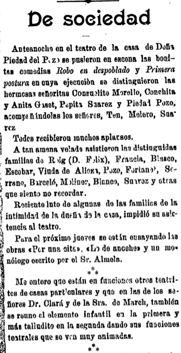 Asimismo, el redactor de la nota la completa en primera persona: «Me entero de que están en funciones otros teatritos de casas particulares y que en las de los señores Dr. Clará y de la Sra. de March, también se reúne el elemento infantil en la primera y más talludito en la segunda dando sus funciones teatrales que se ven muy animadas».