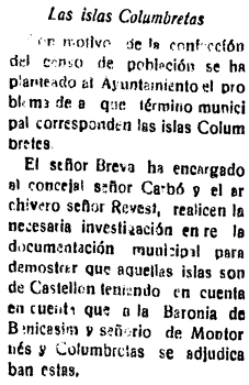 La confección del censo de población plantea al Ayuntamiento de Castellón, a comienzos de 1931, el «problema» de averiguar «a qué término municipal corresponden las islas Columbretes». Así lo recoge La Provincia Nueva, que informa sobre el encargo del alcalde Manuel Breva Perales al concejal Juan Carbó Doménech -alcalde en la década anterior y que fallecería al cabo de unos meses- y al archivero Luis Revest Corzo, para que «realicen la necesaria investigación» con el propósito de «demostrar que aquellas islas son de Castellón, teniendo en cuenta que a la Baronía de Benicasim y señorío de Montornés y Columbretes se adjudicaban estas».