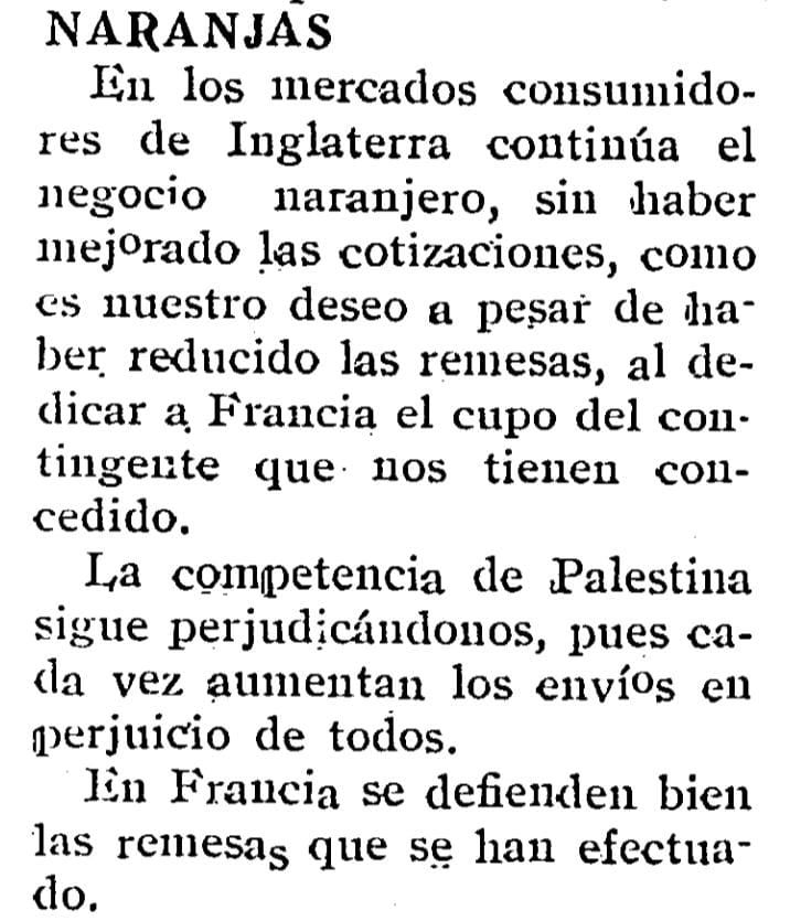A comienzos de 1936, República aporta a sus lectores, como el resto de periódicos castellonenses, información diaria de la evolución de la exportación citrícola a mercados tan relevantes como el británico. Así, en esta nota muestra su preocupación porque «continúa el negocio naranjero, sin haber mejorado las cotizaciones, como es nuestro deseo a pesar de haber reducido las remesas, al dedicar a Francia el cupo del contingente que nos tienen concedido». En concreto, llama la atención porque se subraya que «sigue perjudicándonos» la competencia de Palestina -doce años antes de la creación del Estado de Israel- como zona de producción citrícola: «cada vez aumentan los envíos en perjuicio de todos». Precisamente en 1936 se iniciará la conocida como Gran Revuelta Árabe de los palestinos contra la administración colonial británica de su territorio.