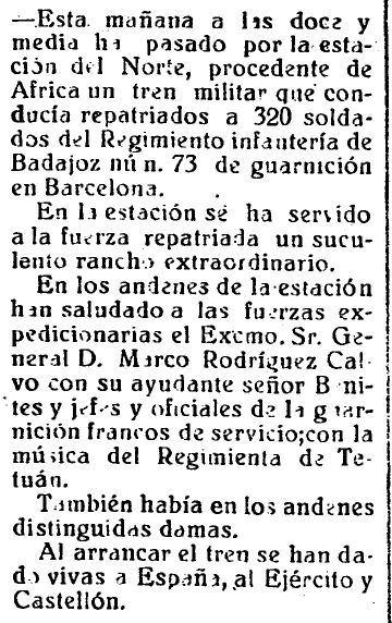 La marcha de la Guerra del Rif llena páginas y páginas de la prensa local en los años 20. En la fase final del conflicto de Marruecos, son frecuentes las notas de actualidad sobre el regreso de los militares españoles a la Península. A mediados de enero de 1926, Heraldo de Castellón se hace eco del paso por la estación de Castellón de «un tren militar que conducía repatriados a 320 soldados del Regimiento infantería de Badajoz núm. 73 de guarnición en Barcelona». A la tropa se le sirve «un suculento rancho extraordinario», siendo saludadas las fuerzas expedicionarias por el general Marco Rodríguez Calvo. El periódico reseña que en los andenes también había «distinguidas damas», antes de añadir que al despedirse el tren se dan vivas a España, al Ejército y a Castellón.