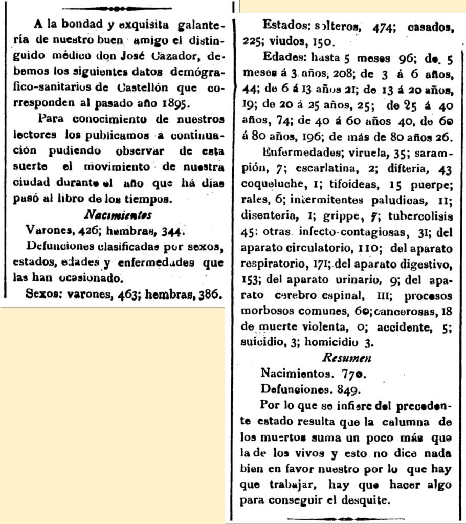 En enero de 1896, Heraldo de Castellón publica unos «datos demográfico-sanitarios» de la ciudad de Castellón correspondientes al año anterior, proporcionados por el «distinguido médico» José Cazador Martín, vocal de la primera Junta de Gobierno del Colegio Oficial de Médicos de Castellón. Con ellos se hace repaso del «movimiento» del ejercicio anterior, «el año que ha días pasó al libro de los tiempos». En el año se producen 426 nacimientos de varones y 344 de hembras, mientras tienen lugar 463 defunciones de varones y 386 de hembras.