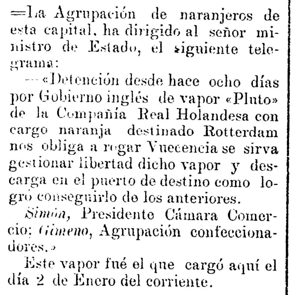 La I Guerra Mundial afecta de forma directa al tráfico marítimo internacional y obviamente, al comercio naranjero desde La Plana. Según relata Heraldo de Castellón, en enero de 1916, la «Agrupación de naranjeros» de la capital dirige un telegrama a Miguel Villanueva, ministro de Estado -hoy de Relaciones Exteriores- para pedirle que active gestiones para la liberación del vapor Pluto de la Compañía Real Holandesa que está detenido «desde hace ocho días por el Gobierno inglés», para que pueda descargar en el puerto de Rotterdam «como logro conseguirlo de los anteriores». El mensaje está firmado por José Simón Hernández, presidente de la Cámara de Comercio de Castellón, y «Gimeno», de la Agrupación de confeccionadores (presumiblemente Enrique Gimeno Tomás).