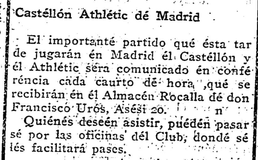El último domingo de enero de 1931, el CD Castellón disputa un encuentro de la Liga de Segunda División en el campo del Atlético de Madrid, entonces Athletic. El castellonense Diario de la Mañana se hace eco de que este «importante partido» será «comunicado en conferencia cada cuarto de hora», a través de unas llamadas «que se recibirán en el Almacén Rocalla de Francisco Urós, ubicado en el número 20 de la calle Asensi. En las oficinas del club, se anuncia, se facilitarán «pases» para quienes deseen asistir al citado almacén para seguir el partido, que finalizará con el resultado de 3-0 para los locales. En marzo, en el Sequiol, el Castellón se impondrá al Atlético por 4-1.