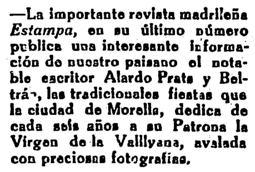 A finales de enero de 1931, Heraldo de Castellón anunciaba en un breve la publicación de «una interesante información» en la «importante revista madrileña Estampa» por parte de «nuestro paisano el notable escritor Alardo Prats y Beltrán«. El tema, nada menos que «las tradicionales fiestas que la ciudad de Morella, dedica cada seis años a su Patrona la Virgen de la Vallivana», con «preciosas fotografías».