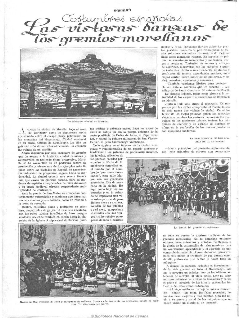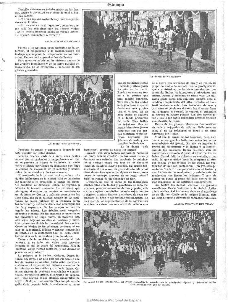 El reportaje aludido se publica en la edición del 24 de enero de Estampa. Bajo el epígrafe Costumbres españolas, se titula Las vistosas danzas de los gremios morellanos. Entre fotografías presumiblemente correspondientes al 39º Sexenni, el de 1928, Prats desliza un texto de buena literatura a doble página, empezando por su arranque: «Aparece la ciudad de Morella bajo el arco del horizonte como un gigantesco navío aprisionado entre el crespo oleaje petrifijado en las montañas del Maestrazgo. Ciudad medieval en su traza. Ciudad de aguafuerte. La ciñe un gris cinturón de murallas almenadas. La coronan las ruinas de un castillo».