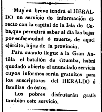 Solo 12 días antes del embarque en Barcelona del batallón del regimiento Otumba, con base en Castellón, para dirigirse a la Guerra de Cuba, Heraldo de Castellón anuncia que «para cuando llegue a la Gran Antilla (…) habrá quedado abierto» un servicio de información «que permitirá saber al día las bajas por enfermedad ó muerte, de aquel ejército, hijos de la provincia». De acuerdo con esta iniciativa, y siempre según el diario, los informes «serán gratuitos para los suscriptores del Heraldo o familias de estos» y finalmente, «los pobres disfrutarán gratis también de este servicio».