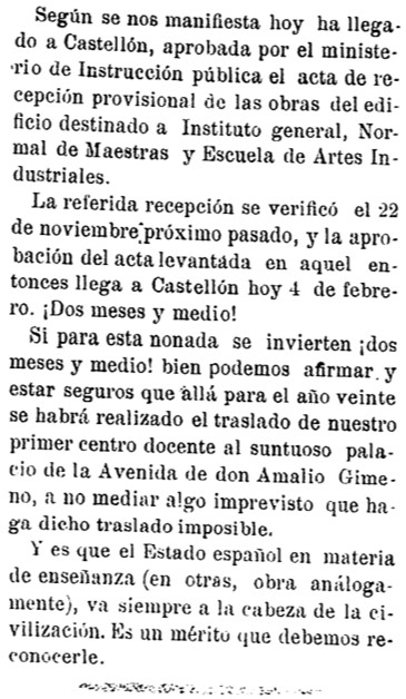 El diario augura que a ese ritmo, «bien podemos afirmar y estar seguros que allá para el año veinte se habrá realizado el traslado de nuestro primer centro docente al suntuoso palacio de la Avenida de don Amalio Gimeno» (también conocida como plaza de Vilarroig). El Clamor afirma con ironía que el Estado español «en materia de Enseñanza (…) va siempre a la cabeza de la civilización». Finalmente, el instituto sería inaugurado mucho antes de 1920, en concreto el 14 de enero de 1917.