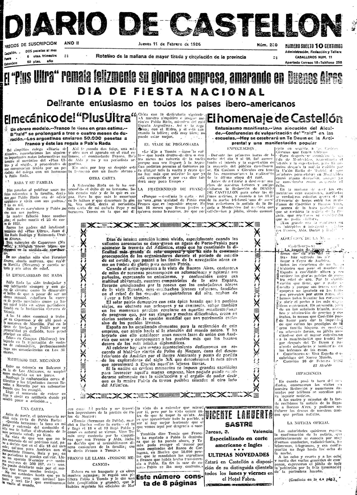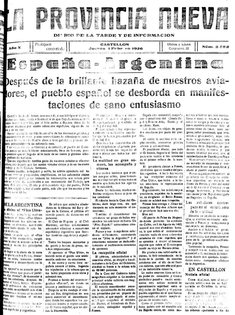 Es la forma de celebrar una gran hazaña de la historia de la aeronáutica española, el épico vuelo del hidroavión Plus Ultra entre España y Argentina a cargo de Ramón Franco -hermano del futuro dictador Francisco Franco-, Julio Ruiz de Alda, el teniente Juan Manuel Durán y el cabo mecánico Pablo Rada. Los cuatro protagonistas de la gesta habían partido de Palos de Moguer a las ocho menos cinco de la mañana del 26 de enero de 1926 y los periódicos de toda España celebraban en sus portadas del 11 de febrero el éxito del viaje. Entre ellos, el propio Diario de Castellón: