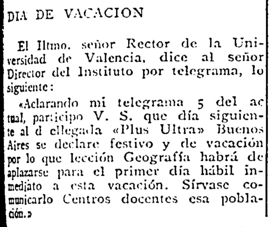Un «día de vacación». Así informa el segundo jueves de febrero de 1926 Diario de Castellón sobre el telegrama enviado por el rector de la Universitat de València, Rafael Pastor González, al director del instituto de Castellón. En su mensaje, el rector «aclara» un telegrama anterior, con el que días antes había declarado «festivo y de vacación» el día siguiente al de la llegada del vuelo del Plus Ultra a Buenos Aires. En este sentido, Pastor señala que «lección Geografía habrá de aplazarse para el primer día hábil inmediato a esta vacación», y pide al director del instituto que traslade la instrucción a los «centros docentes» castellonenses.